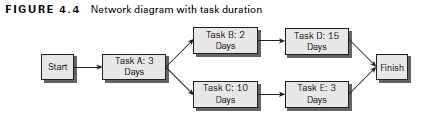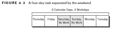 Thursday, the duration for that task will be six calendar days, because no work will be done on Saturday and Sunday. Figure 4.3 illustrates this situation. The same concept applies to holidays or vacation time.