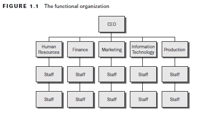 The classic organizational structure is the functional organization , as shown in Figure 1.1. In this structure, the staff is organized along departmental lines, such as IT, marketing, sales, network, public relations, customer support, and legal. Each department is managed