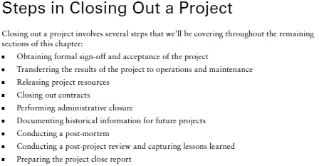 Phase closure occurs at the end of each project phase and involves all the steps listed here. You ’ ll obtain acceptance and sign - off at the completion of each phase as well as at the end of the project. The transfer that occurs in phase completion is the offi cial hand - off to