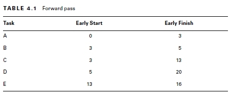 Table 4.1 shows the completed early start and early finish calculations for each of the tasks in the network diagram. Based on the calculations from this completed forward pass, the project is completed on day 20.