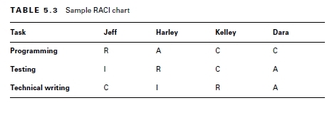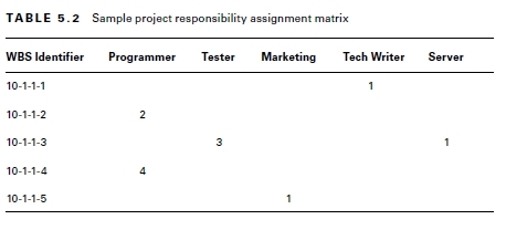 A well - known tool used in project management circles for defi ning and documenting the human resource requirements is a responsibility assignment matrix (RAM) . A RAM is a chart that matches your WBS elements with the required resources. Table 5.2 shows a sample portion of a RAM for an IT development project. It lists the WBS identifi er, the type of resource required, and the number of resources needed for each skill set.