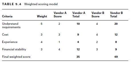 some of the evaluation criteria shown earlier. The scores are assigned a value of 1 to 5, with 5 being the highest score a vendor can earn. You multiply the weight by the score for each element and then sum the totals to come up with an overall score for each vendor. You would almost always choose the vendor with the highest score using this selection method.