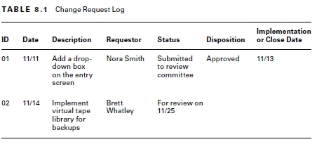 A number of things should happen once the change request is submitted. First, it should be assigned an identifying number for tracking purposes. Then, it should be recorded in the change request log. This log is easy to construct in a spreadsheet fi le. Table 8.1 shows a sample change request log.