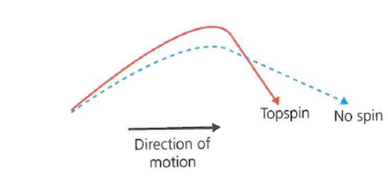 Topspin - Creates a downward Magnus force, shortening the flight path