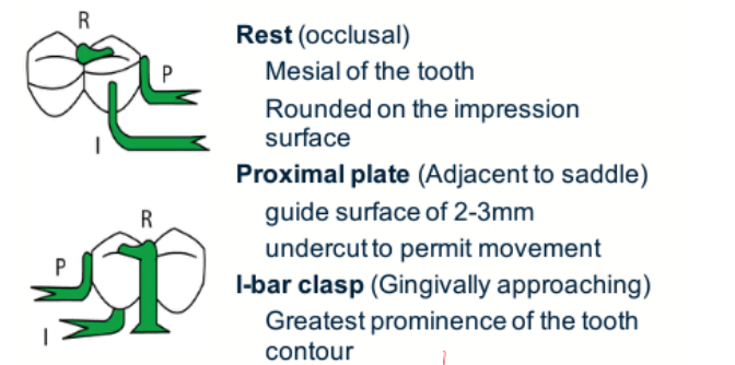 Stress relieving clasp system used in free end saddles.– rest seat mesial to saddle area, proximal plate and I-bar.