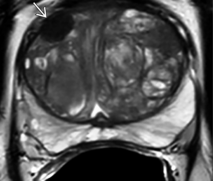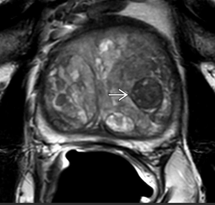 Nódulo anterior na zona de transição, hipointenso em T2, bem circunscrito e homogêneo, sem cápsula..