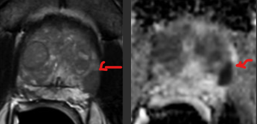 ADC axial mostra sinal marcadamente diminuído (esquerda). A imagem correspondente em DWI mostra sinal marcadamente aumentado. Escore PI-RADS DWI foi 5. Escore PI-RADS global é 5. Biópsia revelou câncer com Gleason 4+3 (grupo de grau 3).