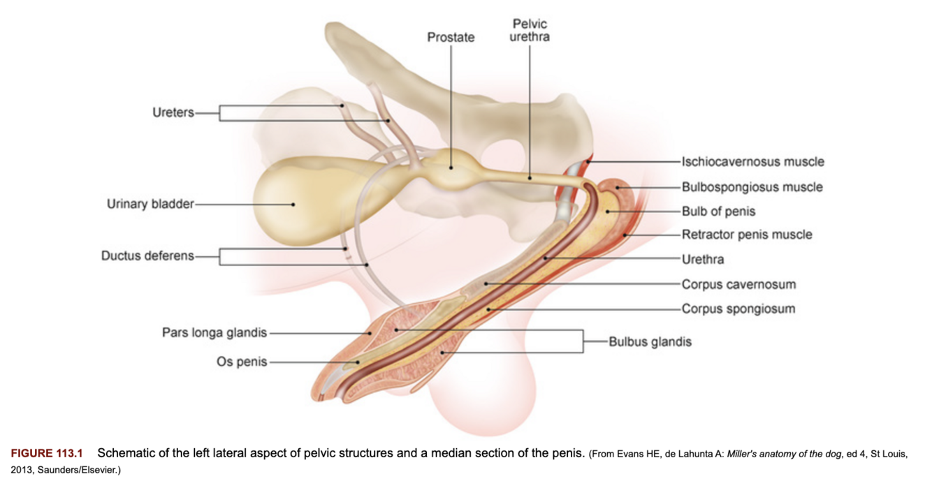 Dyschezia, dysuria, hindlimb stiffness, penile discharge, edema of the pelvic limbs.