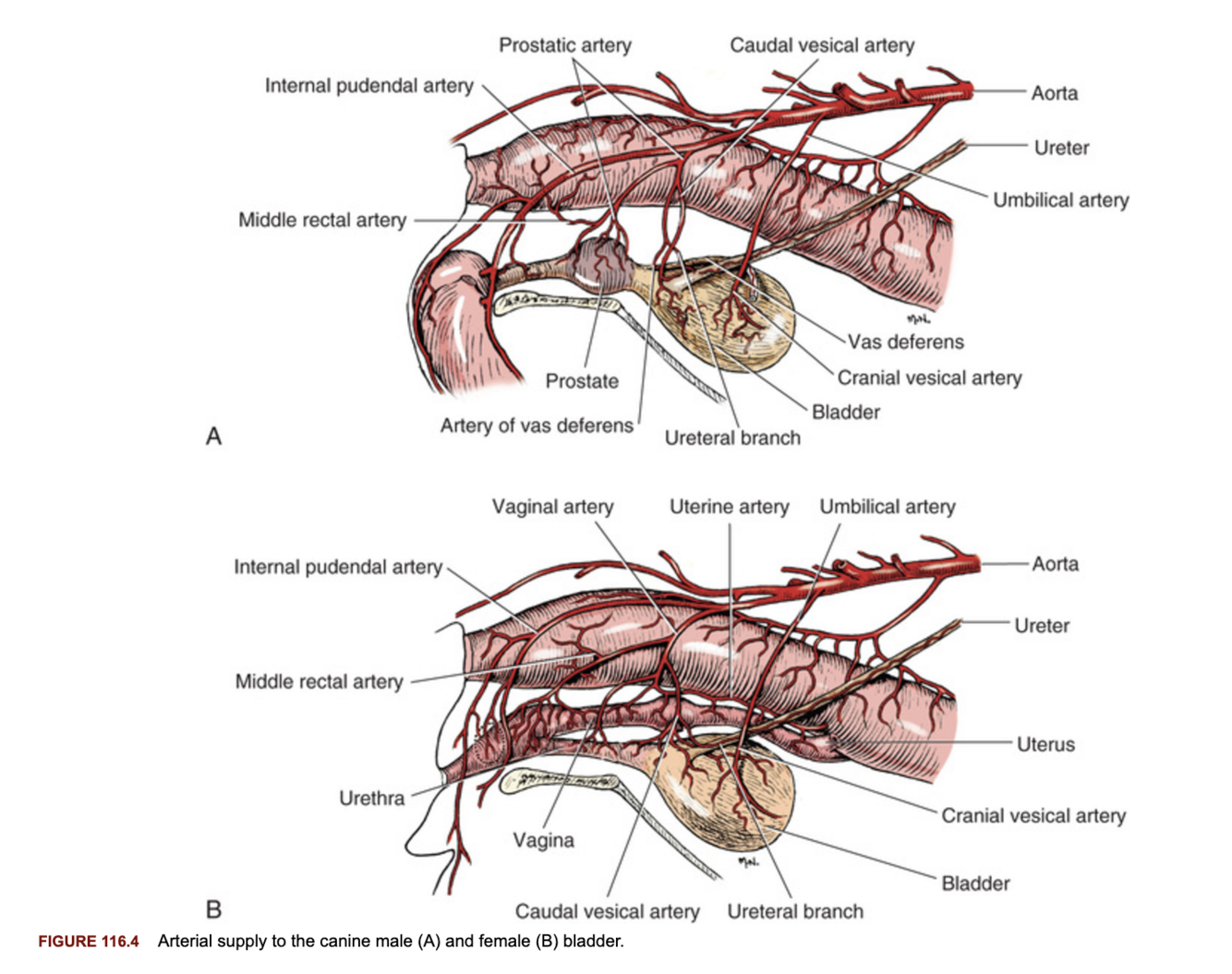 Prostatic arteries arise from the internal pudendal vessels, divide into cranial, middle and caudal branches before becoming subcapsular.
