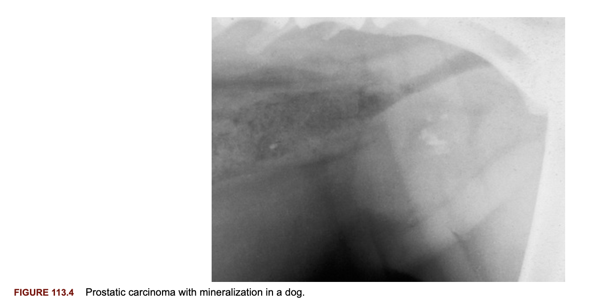 Symmetrically enlarged prostate with largely negative laboratory findings. Ultrasound appearance can aid in ruling out other conditions. Cytology can be confirmatory (multiple samples usually required).