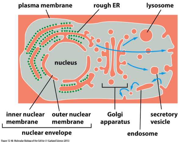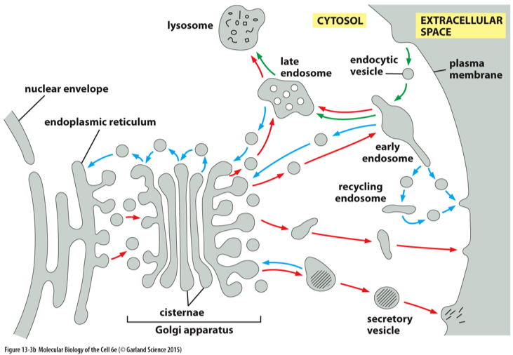 They are then trafficked out through secretory vesicles destined for the plasma membrane or vesicles destined for lysosomes