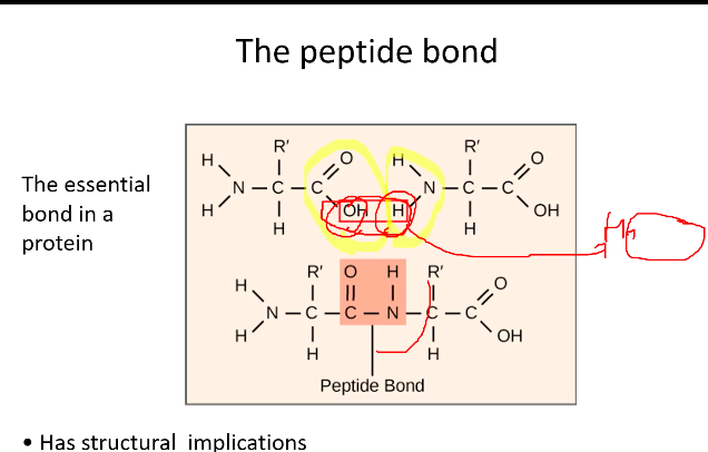 2 a.a. next to each other: hydroxyl group of one a.a. lost from the carboxyl group, H of other is lost from the other a.a. molecule of water leaves = condensation reaction