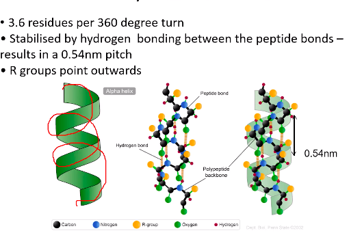 alpha helix: every turn of the helix, get a.a.s forming H bonds (0.54 nm pitch from each other). this stabilise the peptide bonds. R groups point out of helix structure.