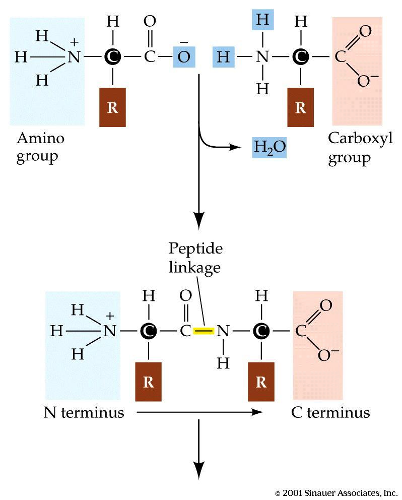 Peptide bonds form via dehydration reactions. Peptides join the carboxy terminus region with the amino terminus region of amino acids.