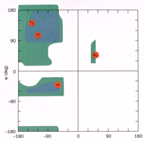 ramachandran plot of parallel B sheet, antiparallel B sheet, alpha helix and left-handed alpha helix