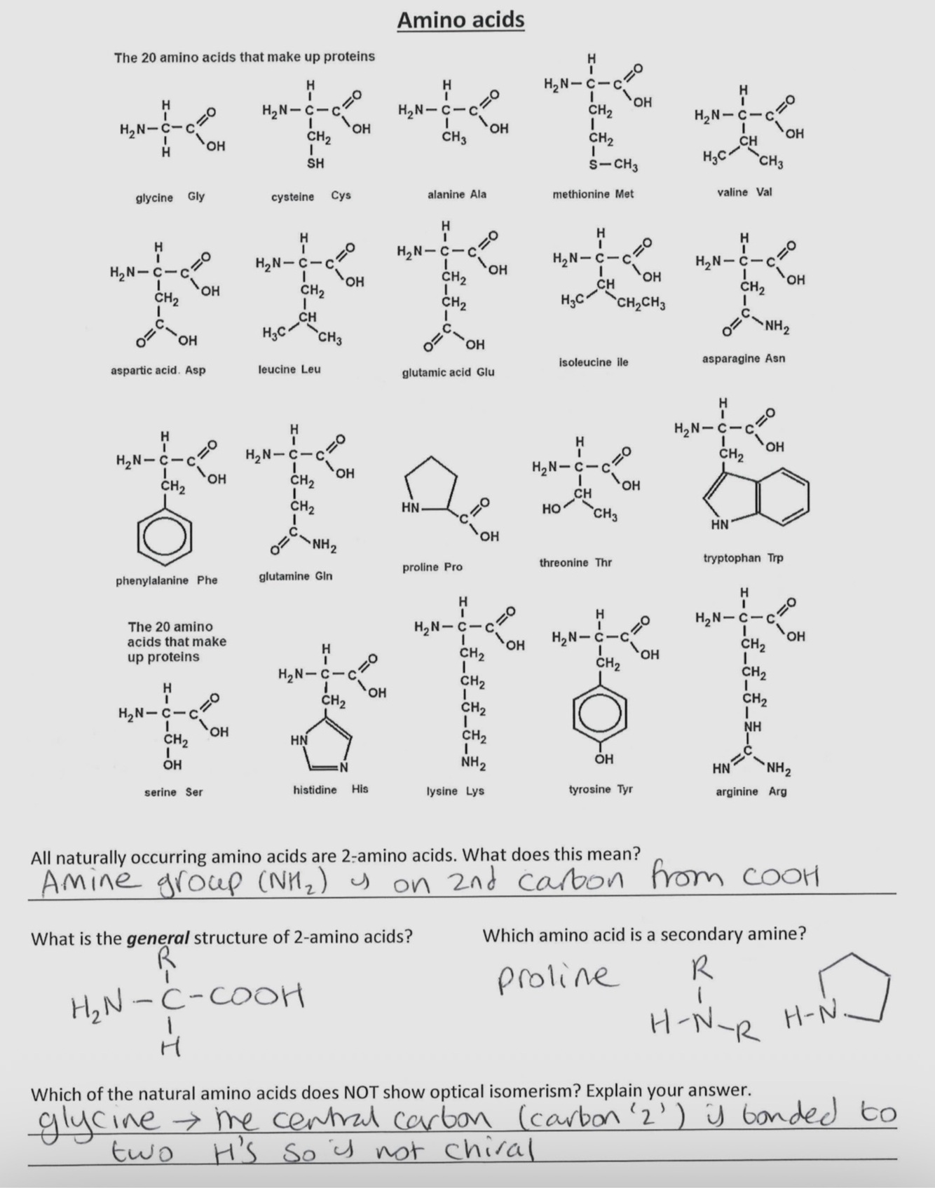 Amino acids general structure and which one forms a secondary amine and do they show optical isomerism