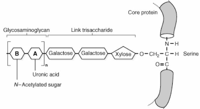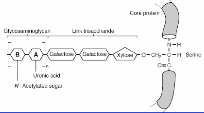 GAG’s are linked to the core protein via O-Glycosidic linkages to serine residues in the protein backbone