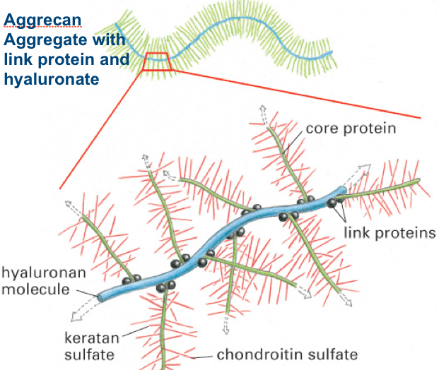 Aggrecan is a large proteoglycan that can aggregate with link proteins and hyaluronate to form very large aggregates. Forms Cartlidage