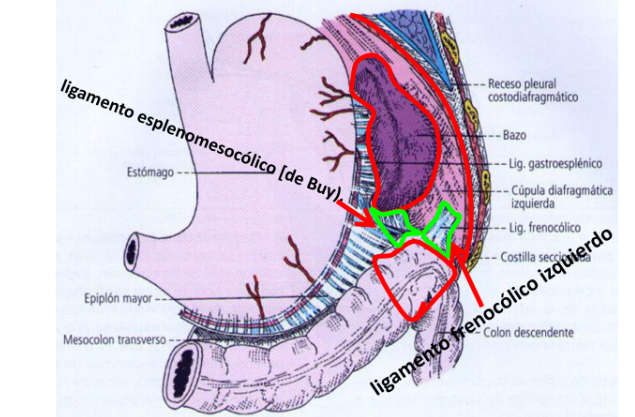 El ligamento “sustentaculum lienis”, ¿une cuáles estructuras?