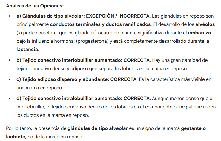 Es característica histológica de la glándula mamaria en reposo, a excepción de: