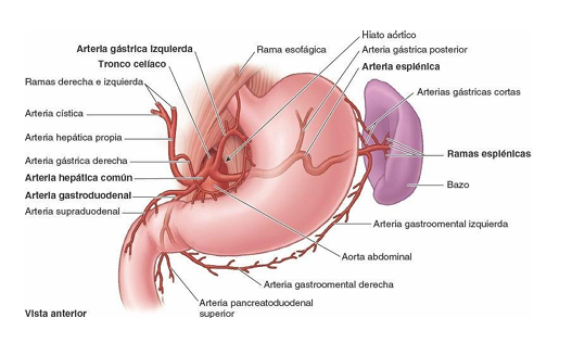 ¿Donde nace la arteria que irriga la curvatura menor del estómago porción superior?