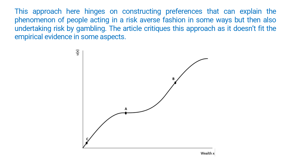 suggest a utility function that is concave for small amounts of money, becomes convex for medium amounts of money, and returns to a concave form for higher amounts of money. Under this function, paying insurance premiums and gambling at the same time can be explained as rational behaviour of purely financially motivated agents. In particular, the poor buy insurance and may gamble, while the rich only buy insurance but do not gamble, which is largely in line with empirical evidence.