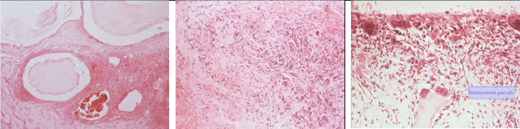 ■ The connective tissue can contain multinucleated giant cells and extravasated red blood cells