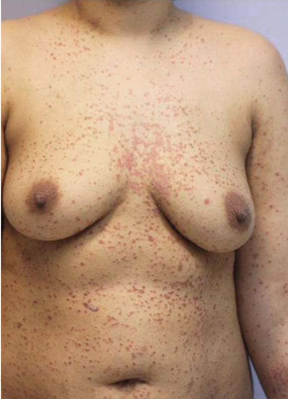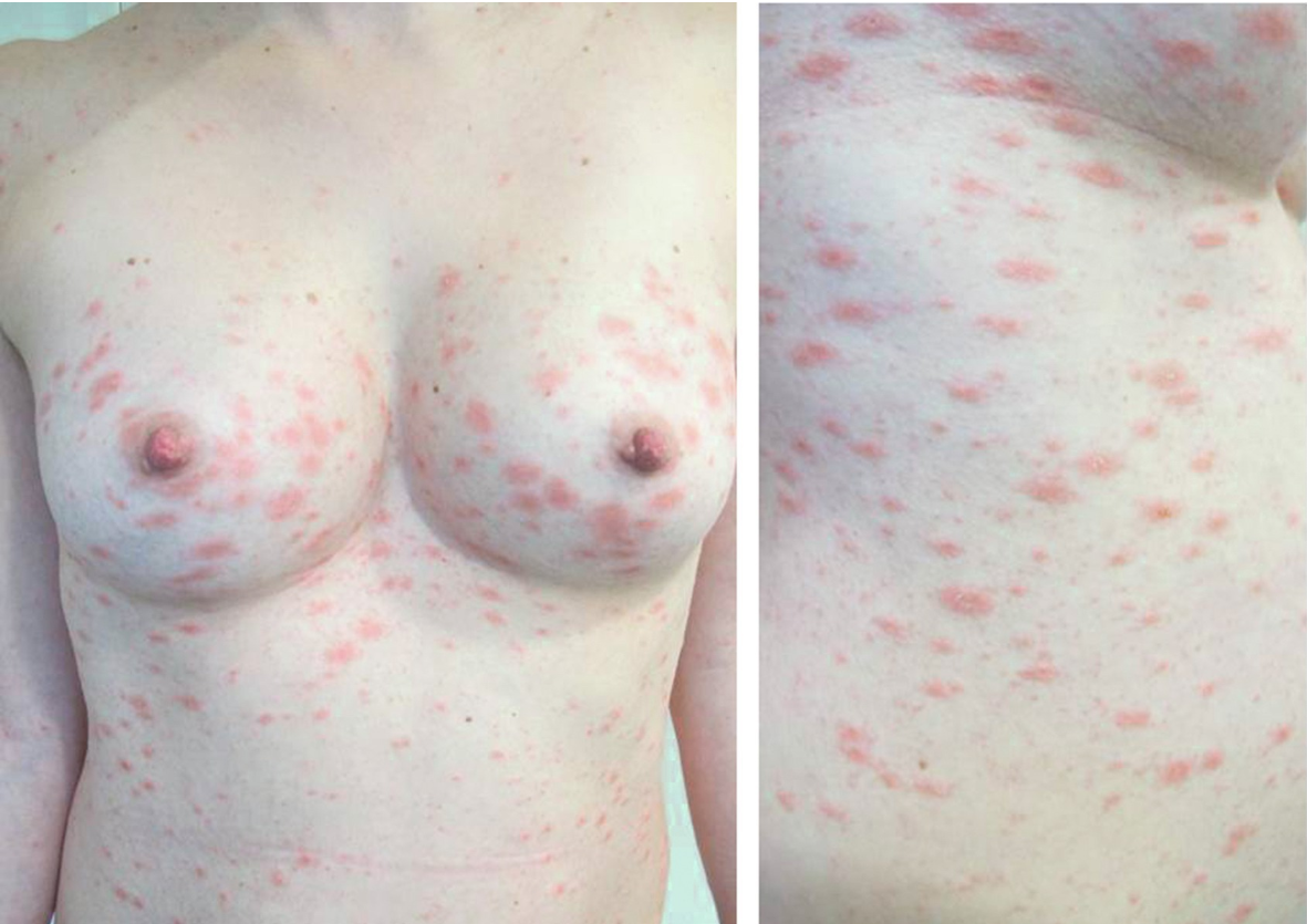 Papule-erythemato-squameuse du tronc au cours d’un pytiriasis rosé de gilbert en medaillon (centre plus clair)