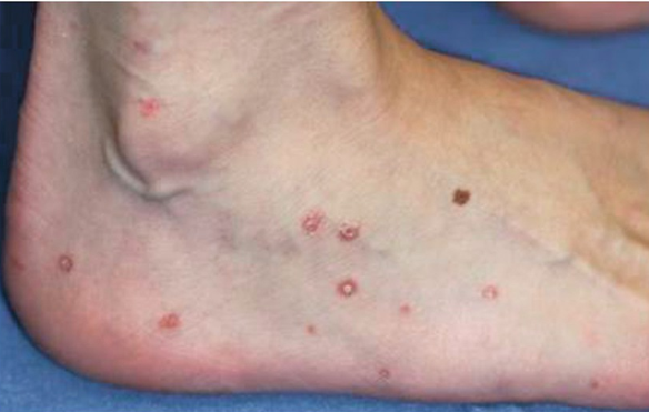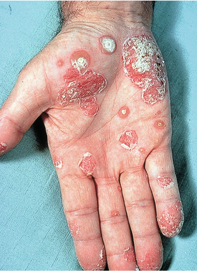Lesion pustuleuse avec erythrose et squame blanchatre