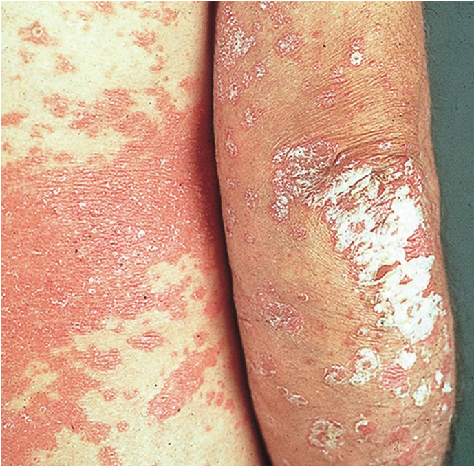 psoriasis en plaque erythemato-squameuse de zones bastion (lombaire et coude)