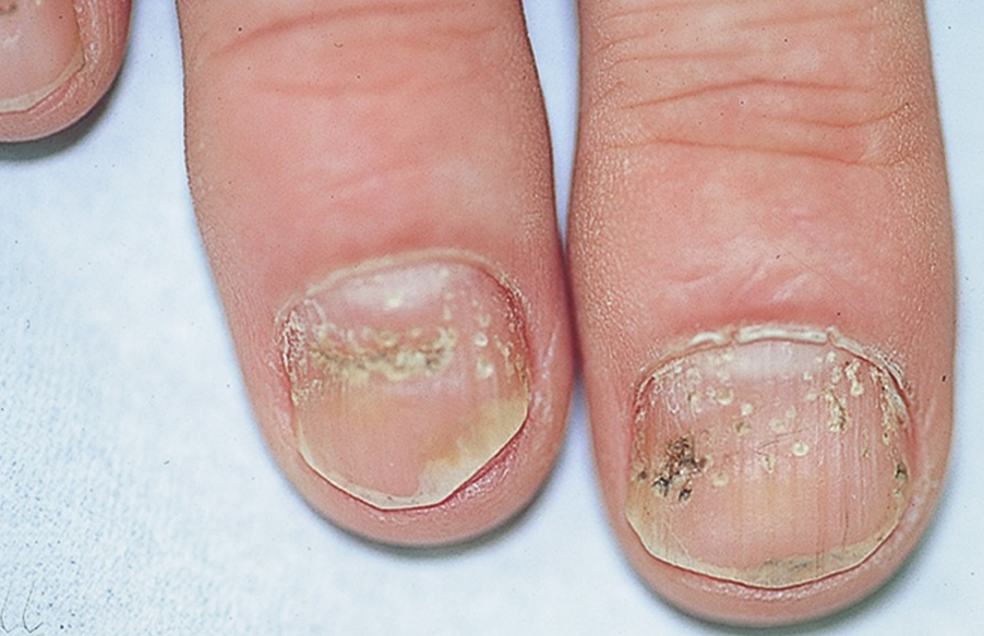 depression ponctué et lesion hyperkeratosique des ongles, ongle en dé à coudre et discrete onycholyse