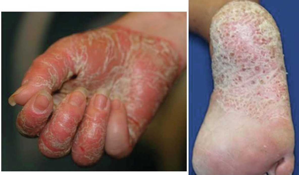 Keratodermie palmoplantaire, avec hyperkeratose et fissure (les fissure provoque des douleur => marche compliqué)