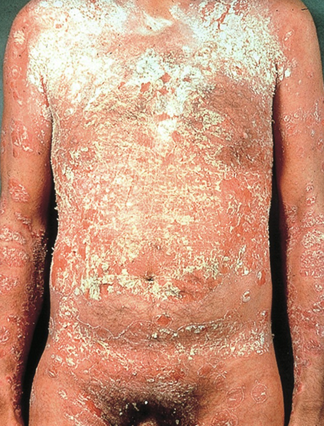 Erythrodermie psoriasiforme : >90% du corps atteint par du psoriasis