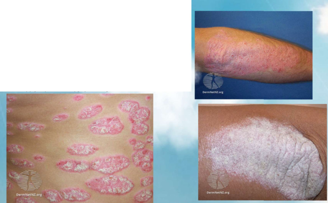 Presentation of chronic plaque psoriasis? (Incl locations)