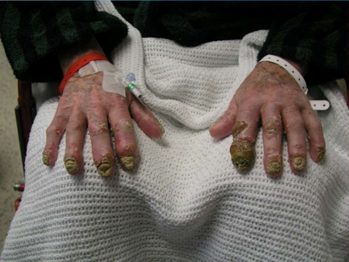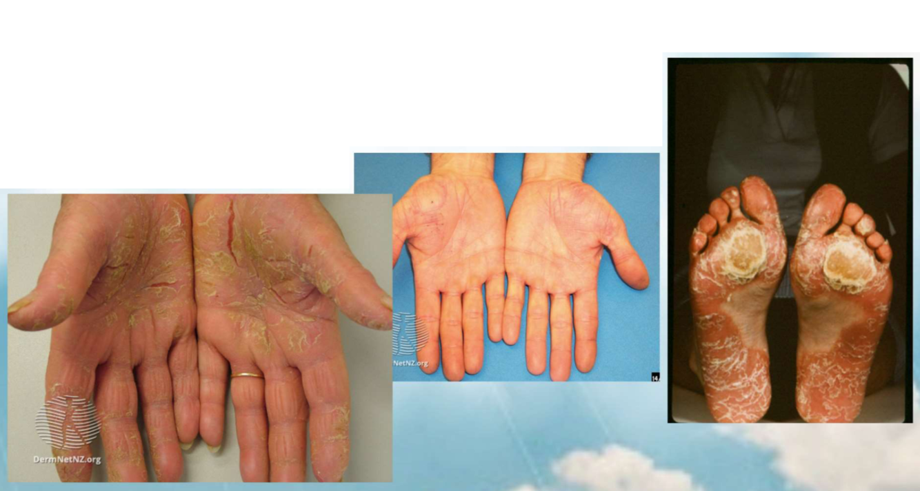 Presents as keratoderma (thickened skin), painful fisuring and yellow pustules