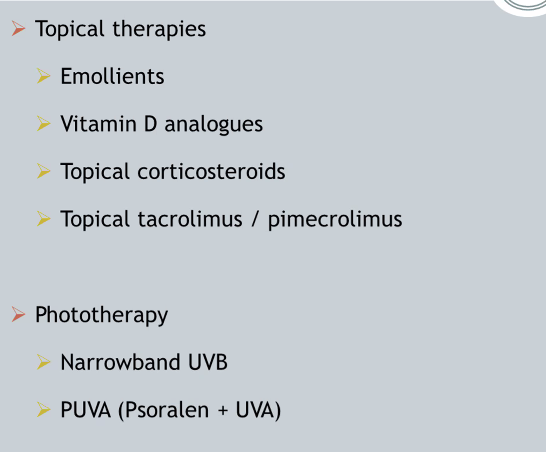 tx with super-potent steroids (beclometasone, oral prednisolone) NOT FOR PSORIASIS OR YOU WILL DESTABILISE IT