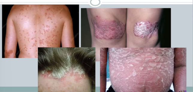Flexural psoriasis = red and shiny, due to the moist nature of the skin in the flexural areas. It affects areas such as the groin, axillae, inframammary folds etc.