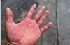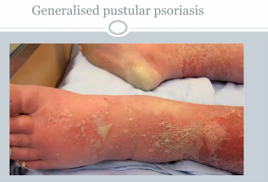 Pustular psoriasis = small fluid filled pustules. It can be localised, or generalised. Generalised is a medical emergency as it can be fatal. The patient often is systemically unwell. They should be immediately referred and managed in secondary care.