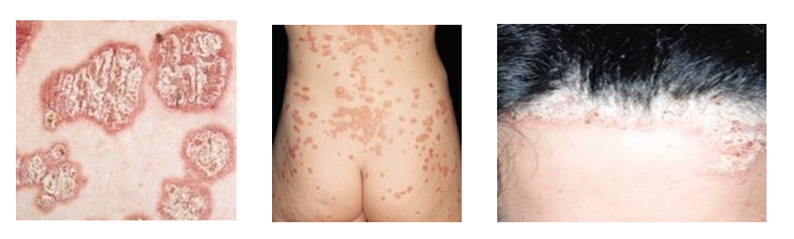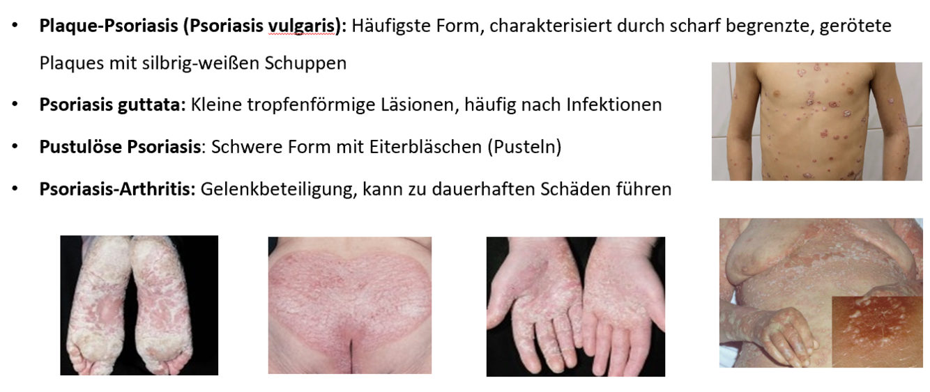a.) Plaque-Psoriasis (Psoriasis vulgaris): Häufigste Form, charakterisiert durch scharf begrenzte, gerötete Plaques mit silbrig-weißen Schuppen