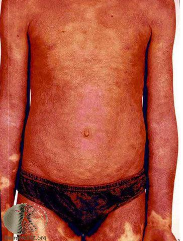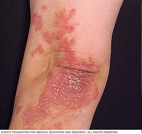 Chronic plaque psoriasis - pinkish red sclay plaques, especially on extensor surfaces such as knees and elbows. Can be present on lower back, ears and scalp as well.