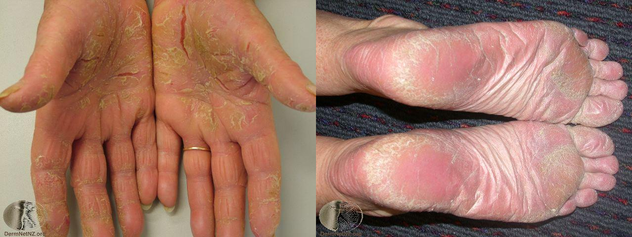Plaques: Yellow-brown pustules on palms and soles