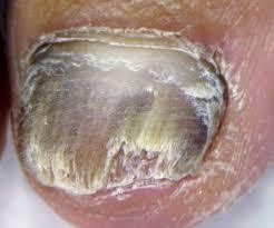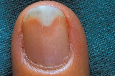 Distal portion of the nail is coming away from the nail bed.