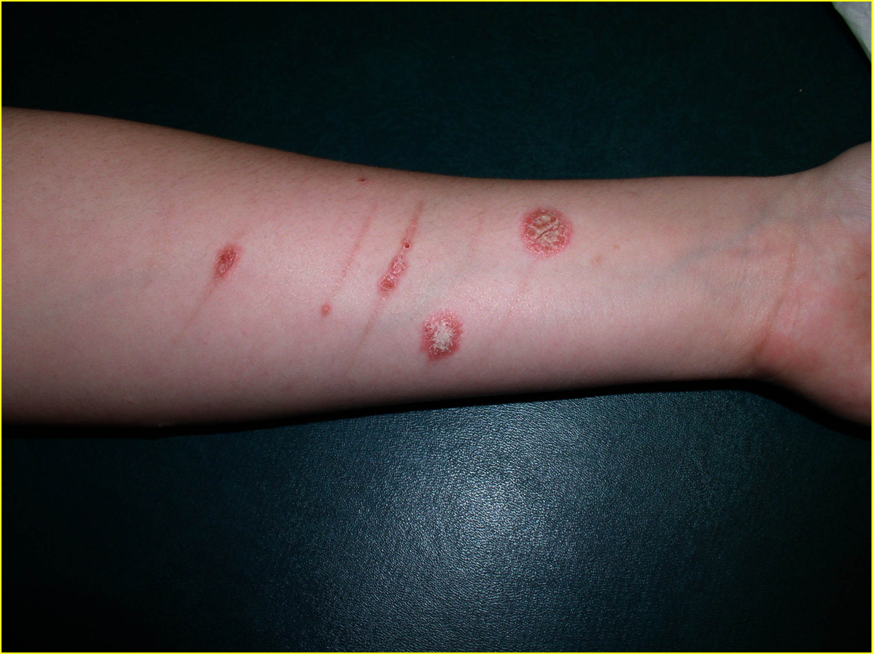 This is where psoriasis develops in sites of trauma 2-6weeks after the trauma is sustained. Examples of trauma it may devleop in include: