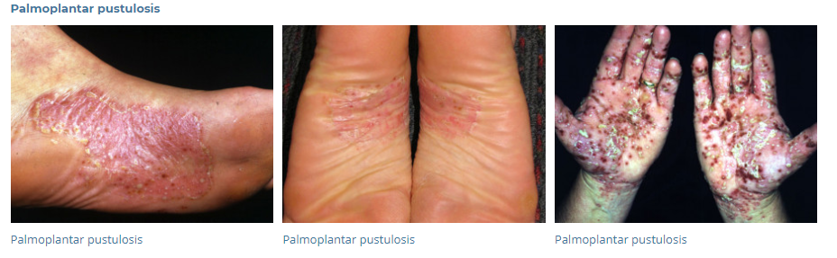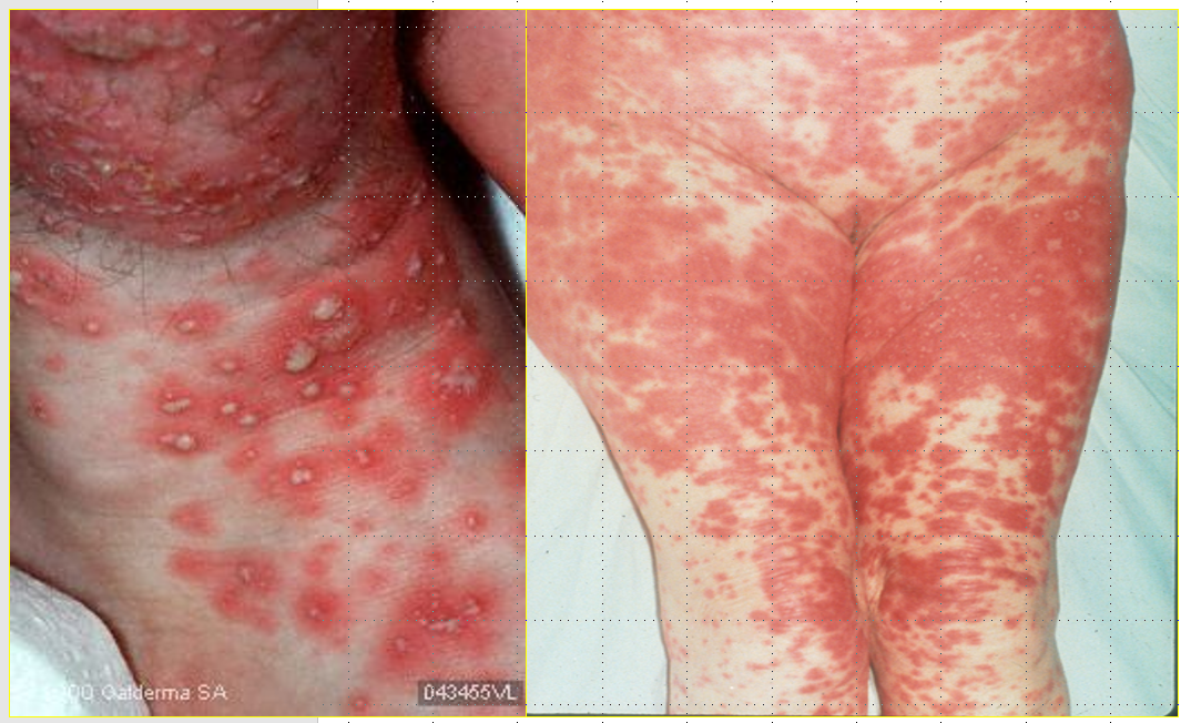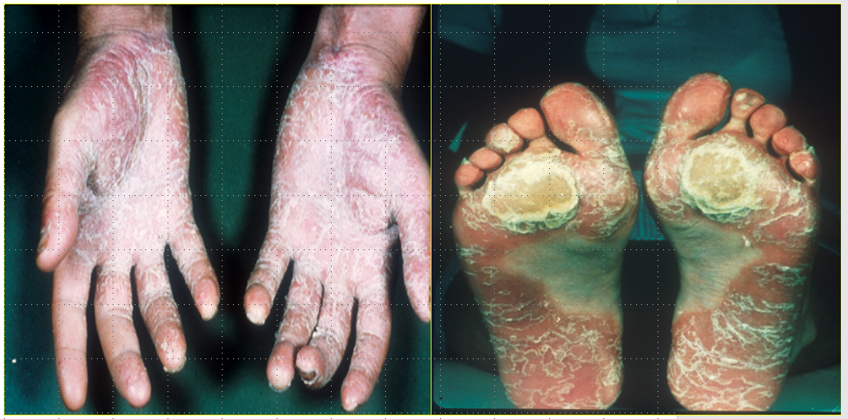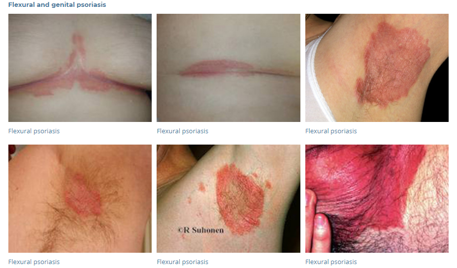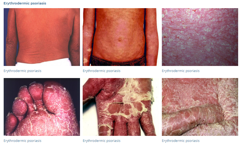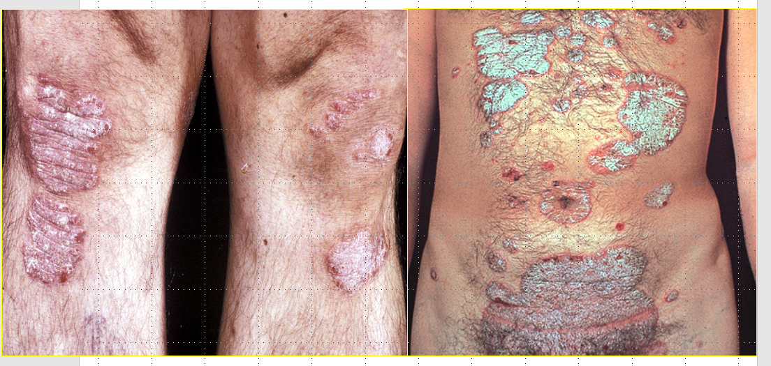 The most common sites are scalp, elbows and knees, but any part of the skin can be involved.