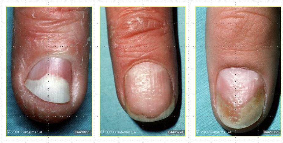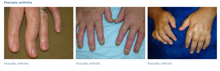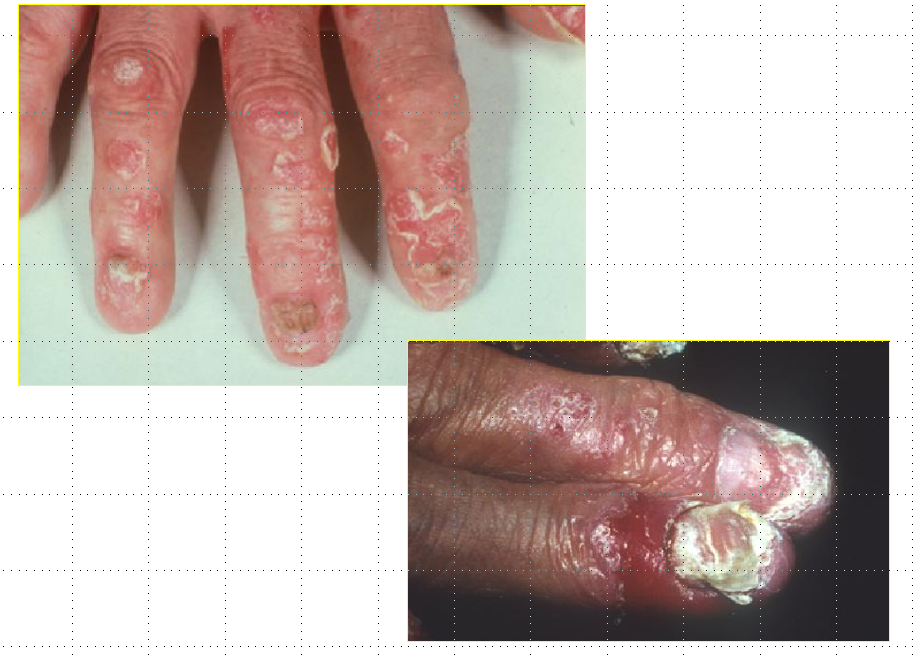 Nail psoriasis can affect any part of one or more nails. There are often scaly plaques on the dorsum of the hands and fingers due to associated plaque psoriasis.