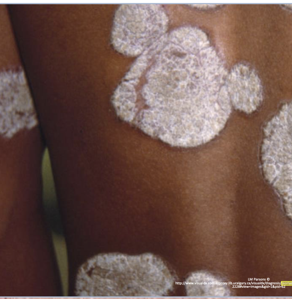 plaque psoriasis- lichenification and white scale as a secondary morphology. initial erythematous plaques