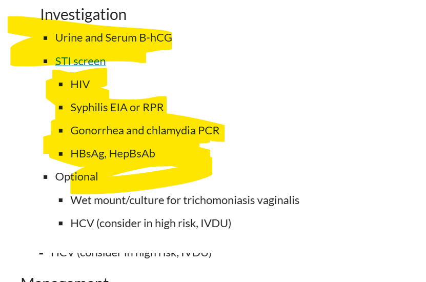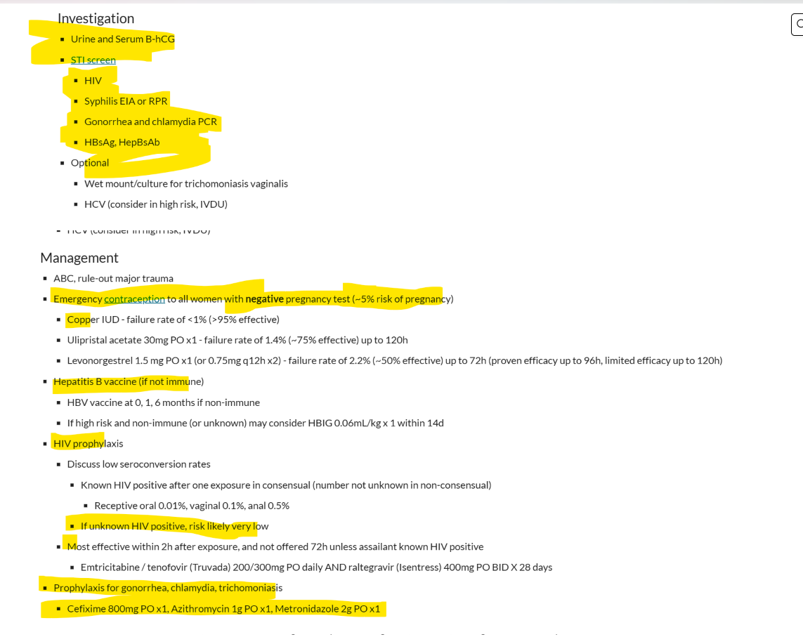 résume moi les investigations et le management médical pour un patient post exposition à une agression sexuelle avec penetration
