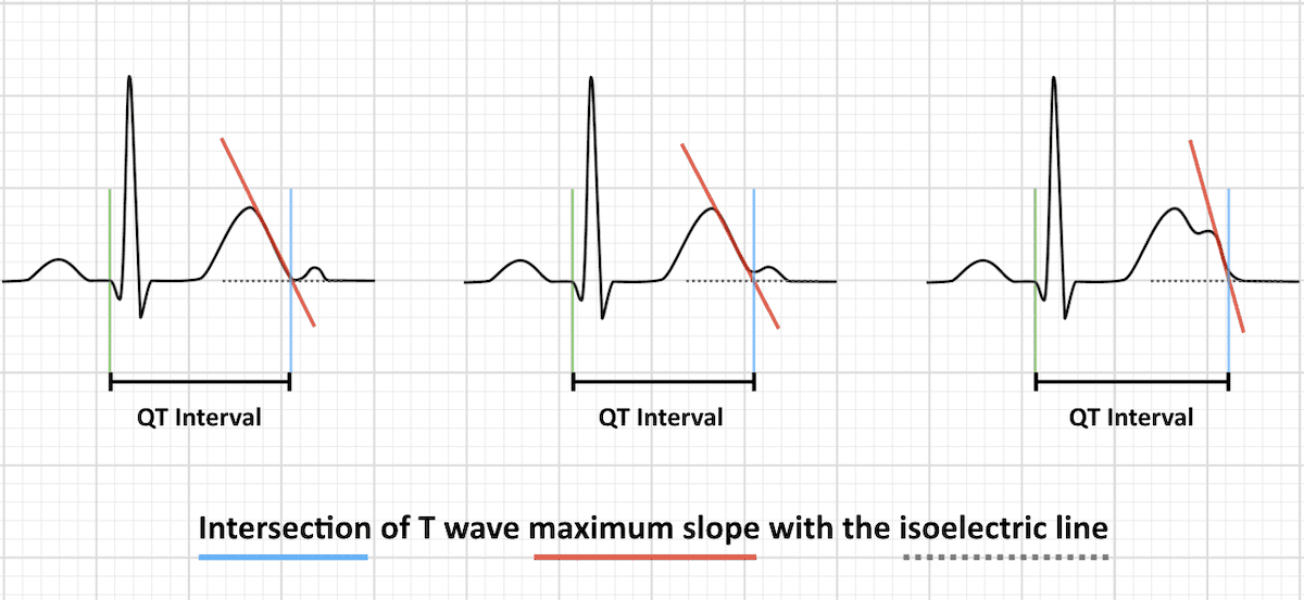 QT interval: varies with heart rate, prolonged with some drugs (>12 small squares)