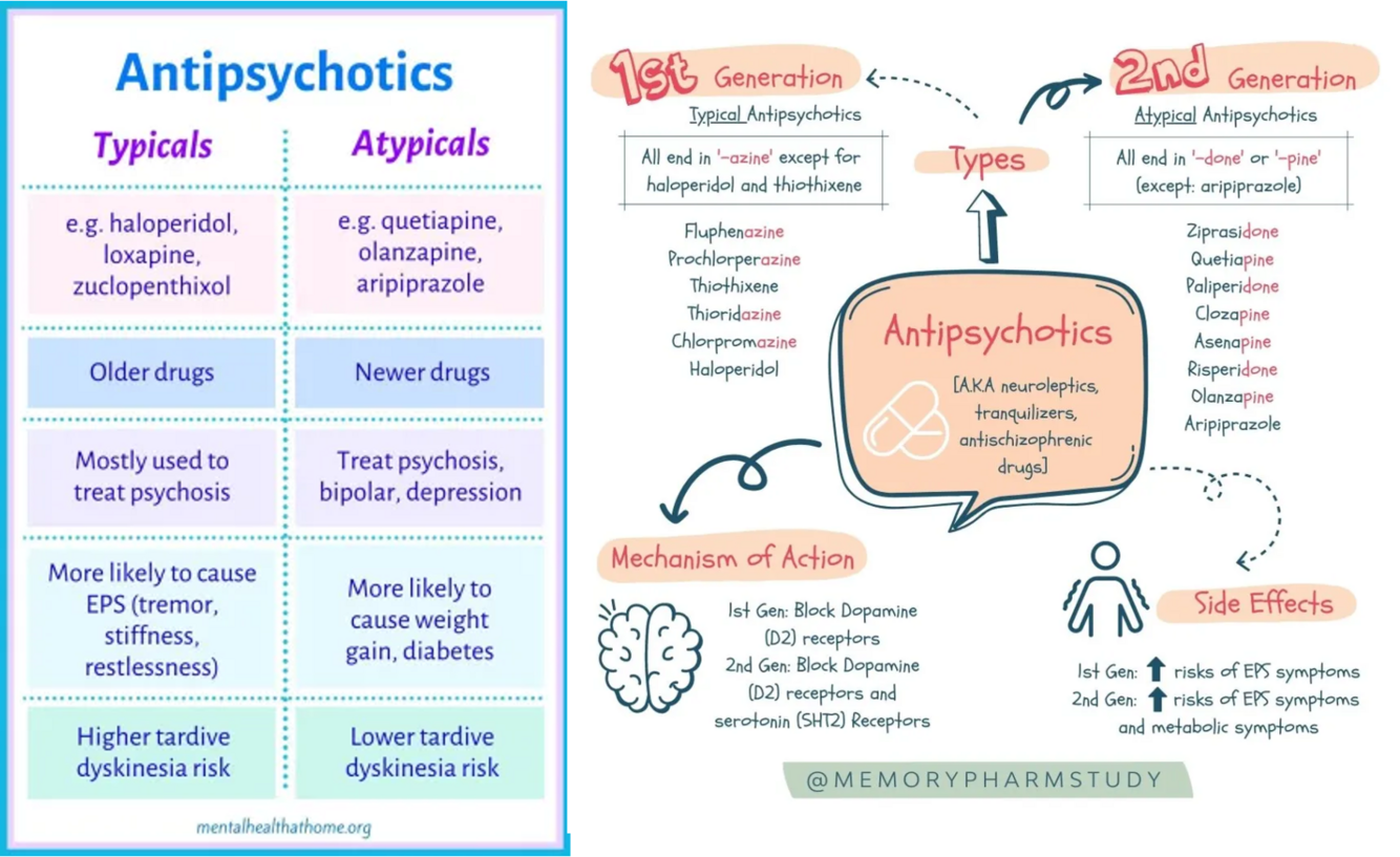 which type of antipsychotic is associated with a main side effect and how is the SE managed
