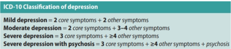 Core symptoms - low mood, lack of energy or anhedonia